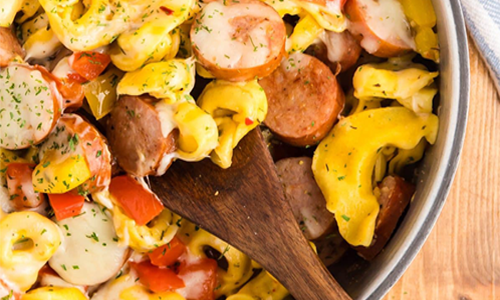 While the kielbasa is cooking, cook 19 ounce package cheese tortellini to the package directions and drain. Set aside.